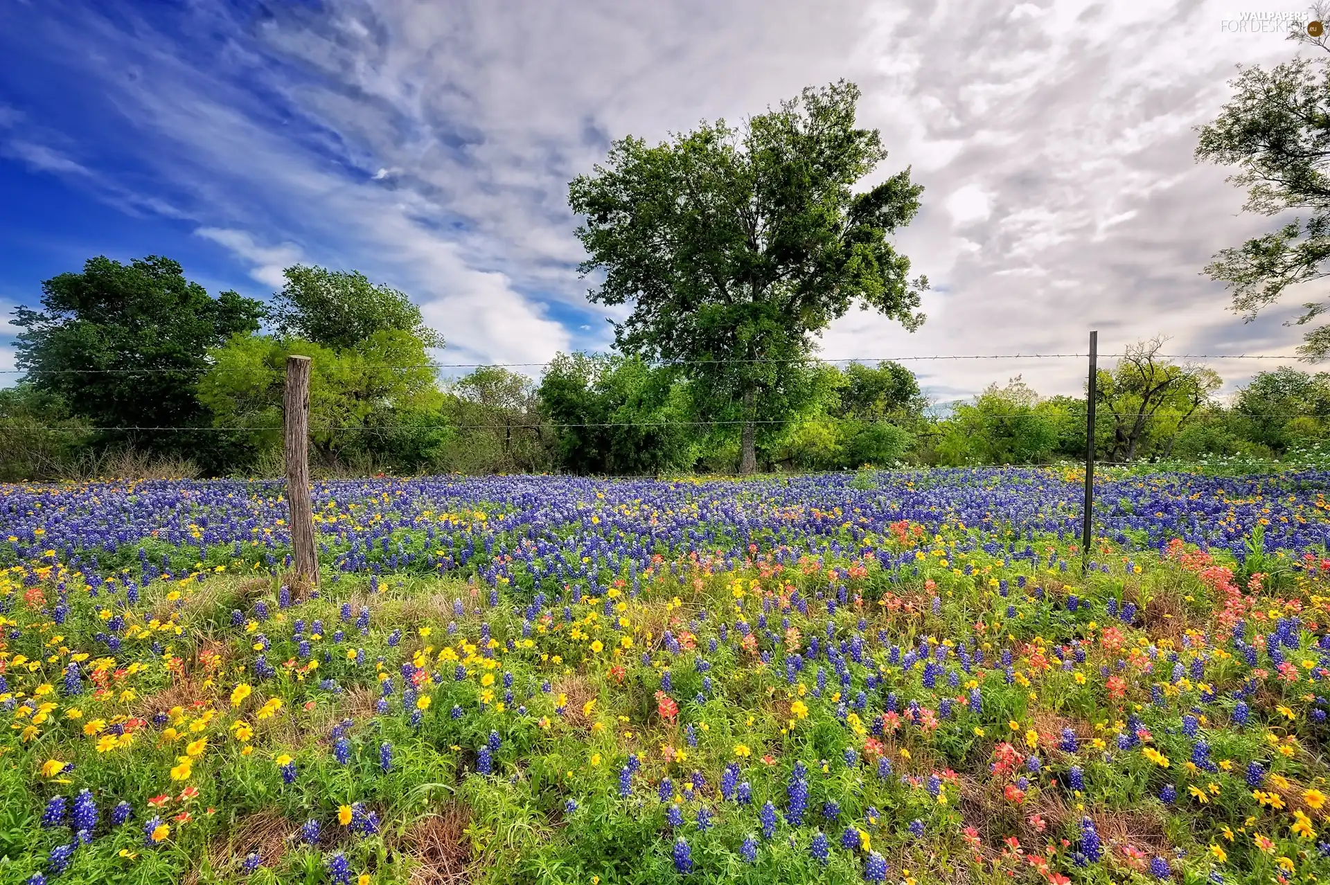 fence, trees, Meadow, clouds, Flowered, viewes